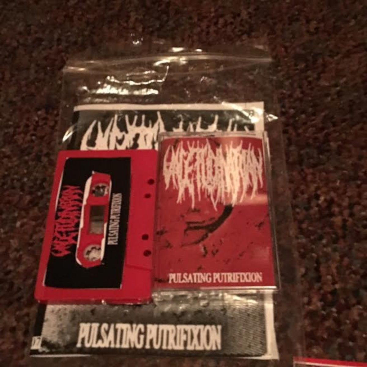 Cassette version of Pulsating Putrifixion by Valetudinarian. Hard shell case housed inside a ziplock bag with inserts and art.
