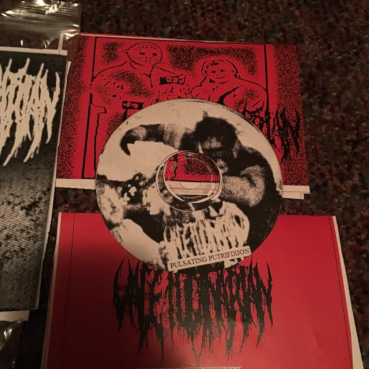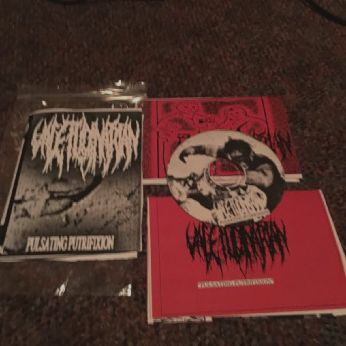 Compact disc of Valetudinarian - Pulsating Putrifixion. CD housed inside a ziplock bag full of inserts and art.
